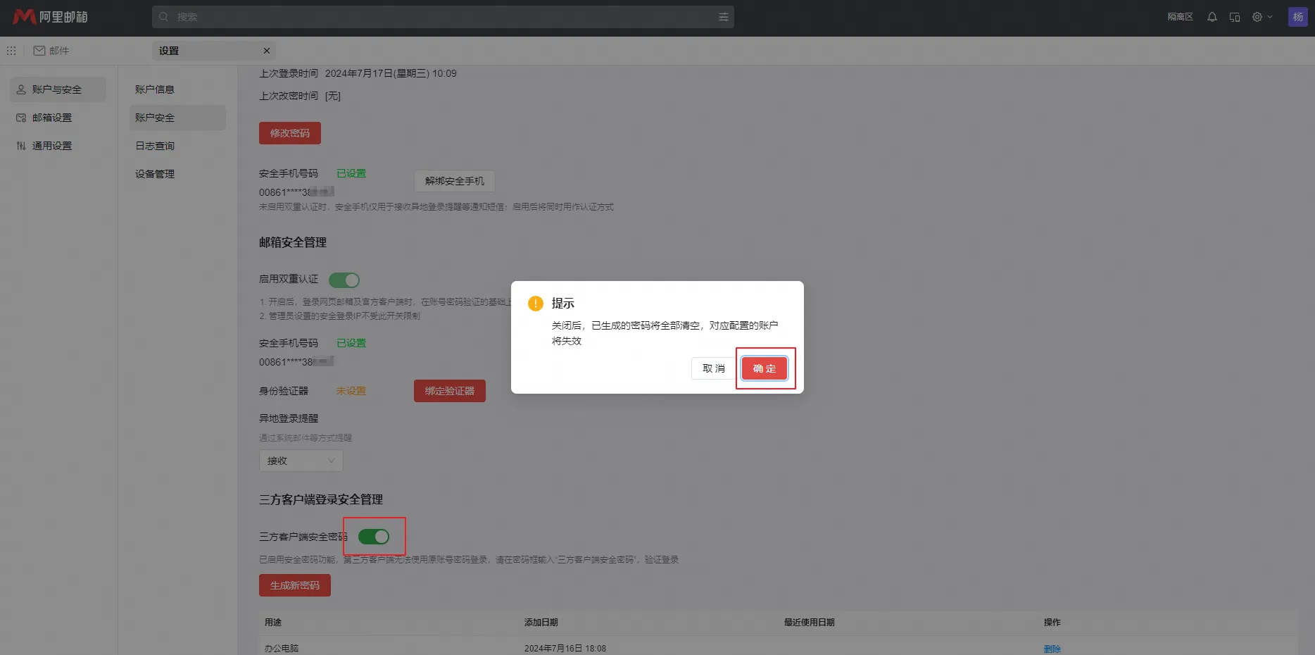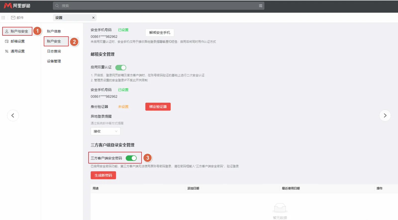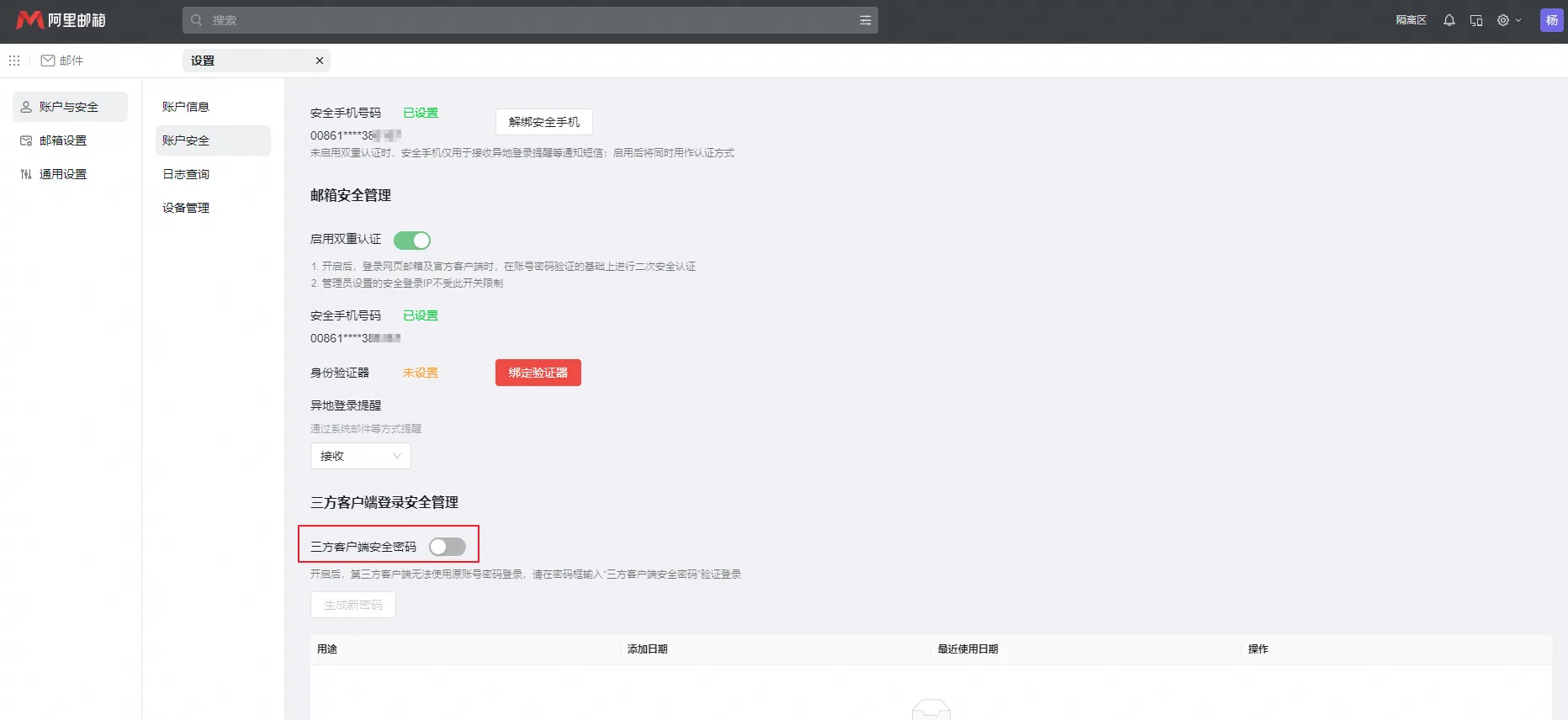 1、登录阿里邮箱网页端,设置->账户与安全->账户安全->三方客户端安全管理->启用三方客户端安全密码。