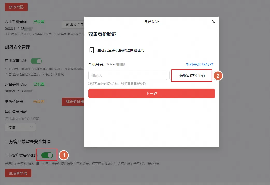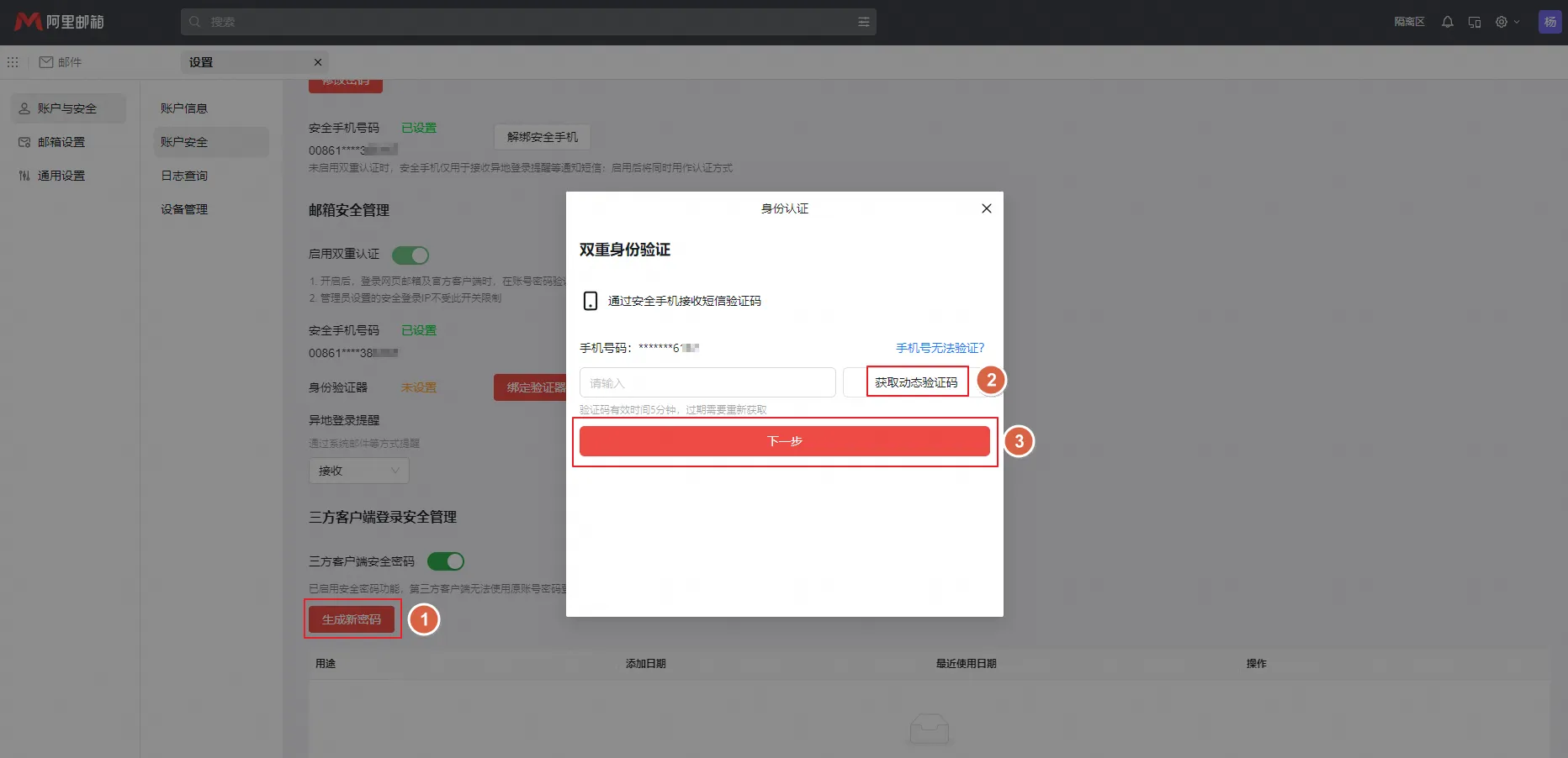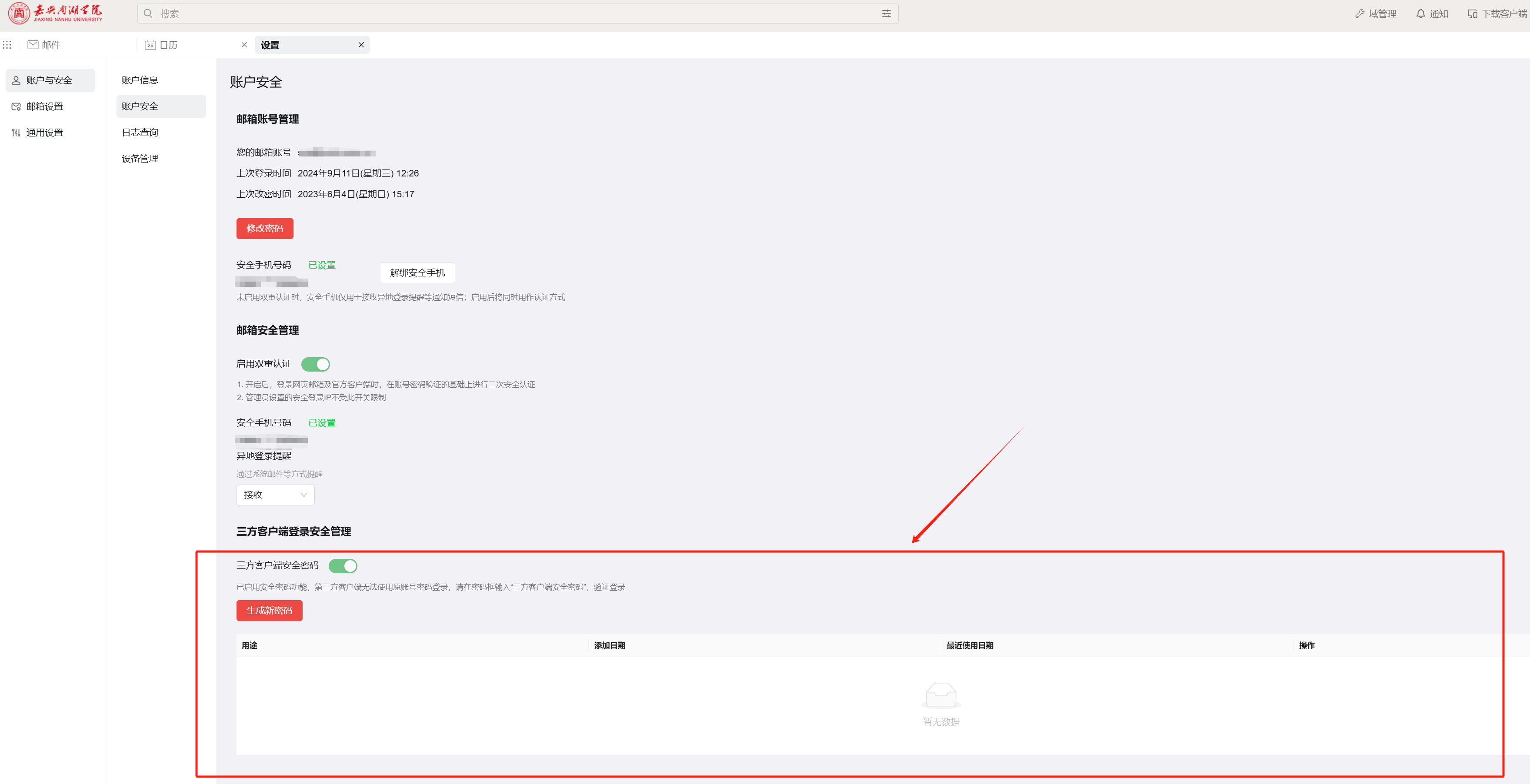 1、登录阿里邮箱网页端,设置->账户与安全->账户安全->三方客户端安全管理->启用三方客户端安全密码。
