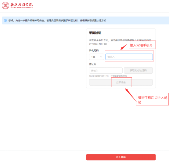 (1)为保证邮箱系统安全与上级主管部门要求,邮箱需绑定密保手机号。系统会弹出需要绑定密保手机(密保手机可以用来找回密码或者邮箱异常短信提醒等),如下图: