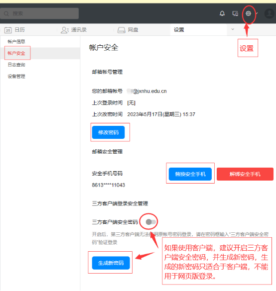 首次登录成功后,用户如果想更换密保手机或者修改密码需要登录网页版邮箱。登录【网页版】-【设置】-【账户安全】-【修改密码】。