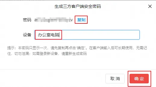 4、将复制的密码粘贴至Outlook/Foxmail的密码框,即可使用三方客户端安全密码登录。